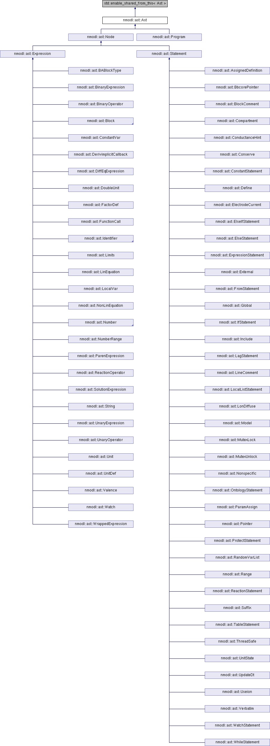 Every node in the Abstract Syntax Tree is inherited from base class ast::Ast. This class provides base properties and pure virtual functions that must be implemented by base classes. We inherit from std::enable_shared_from_this to get a shared_ptr from this pointer.