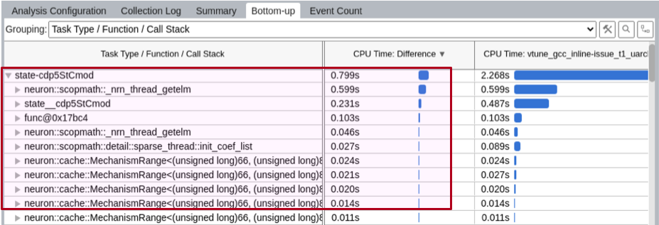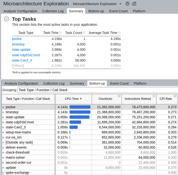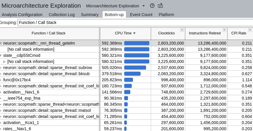But, in the context of NEURON model execution, this is not sufficient because the above measurements summarize the full execution, including model building and simulation phases. For detailed performance analysis, we need granular information. For example: